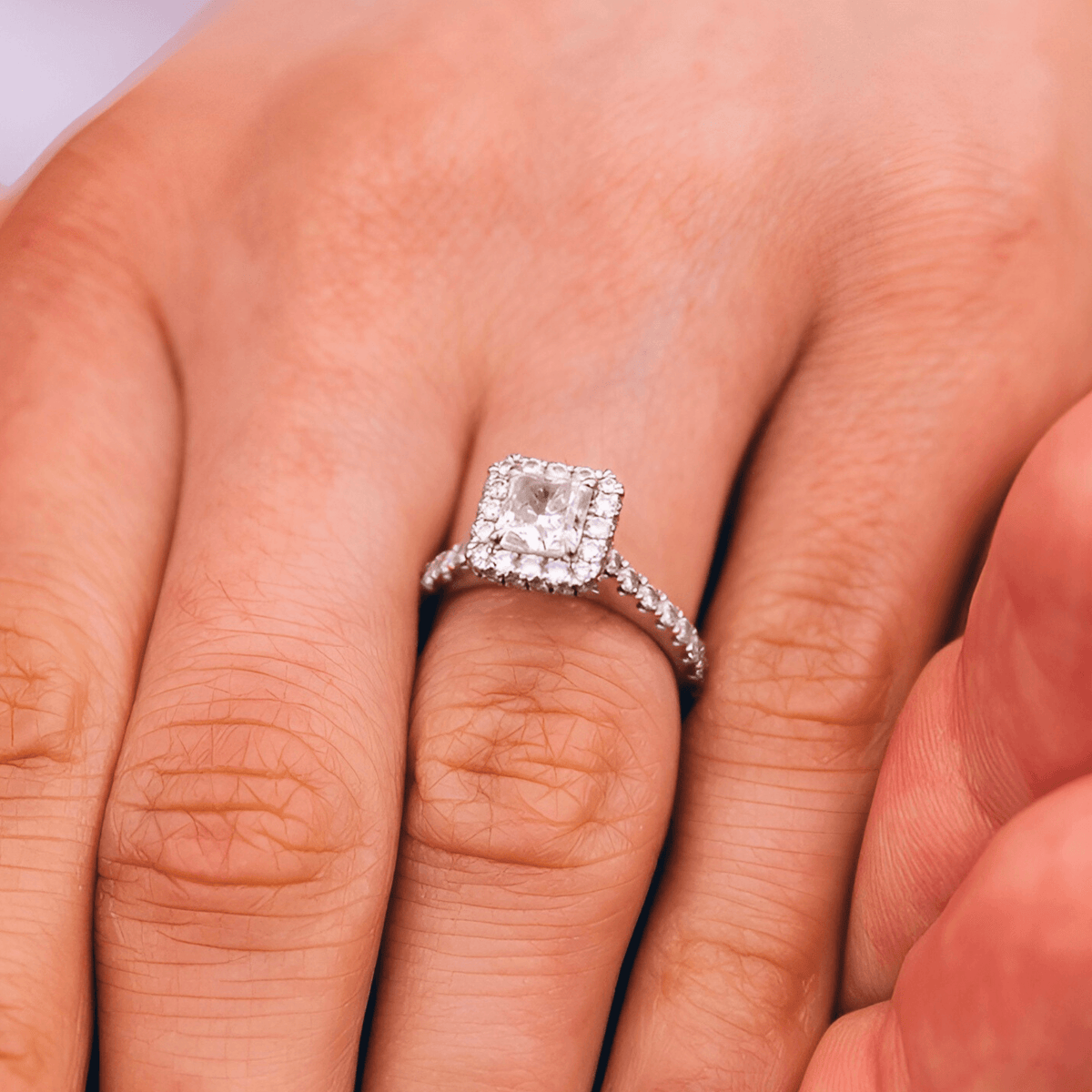Radiant cut diamonds are rectangular or square, with cut corners. They continue to be popular, particularly for engagement rings. The cut is recognized for its remarkable brightness and fire, which rival round brilliant cuts. The stone hides inclusions nicely and seems bigger than its real carat weight. Radiant cuts are often the most lasting due to the absence of sharp points. They are commonly used as the center stones in three-stone rings.