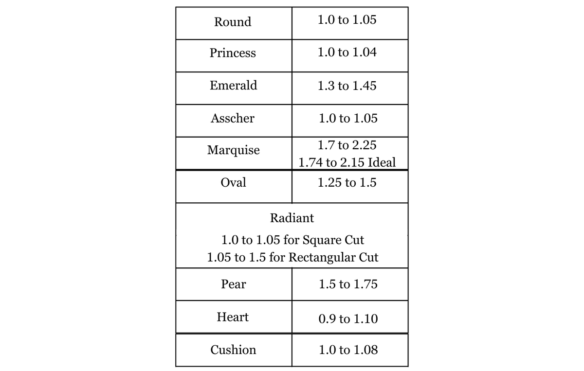 Different diamond shapes have ideal length-to-width ratios (mm) that enhance their visual appeal: