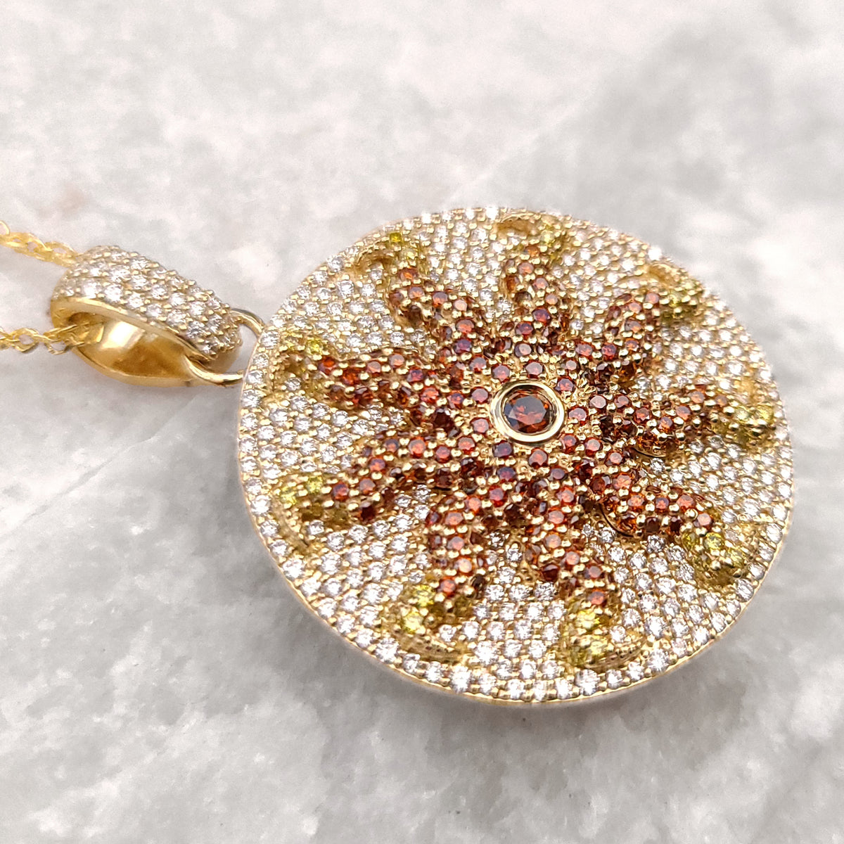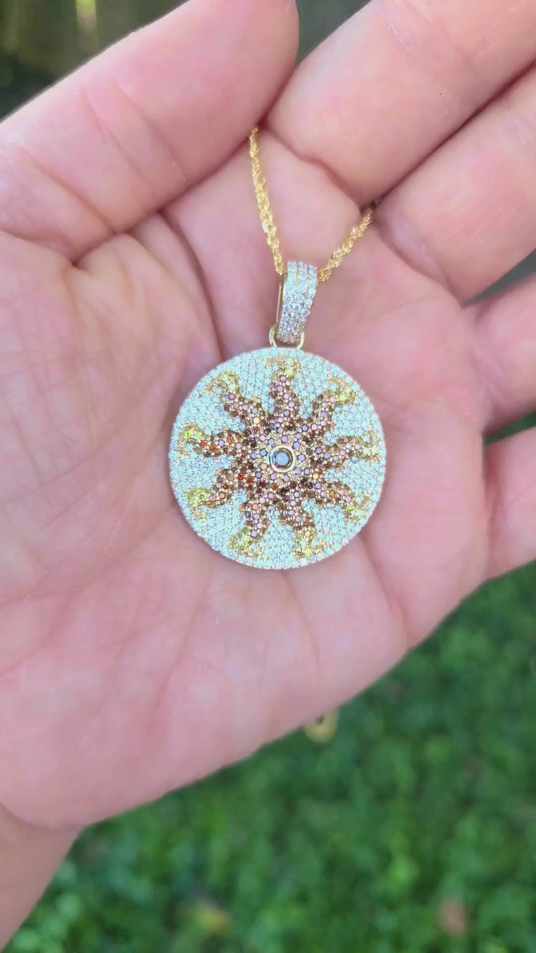 Inspired by the vibrant spirit of Sundance*, this stunning creation captures the essence of the festival in its dazzling design. Originally crafted for discerning attendees during the festival in 2024, it comes in at just under 3 carats and strikes the perfect balance between luxury and wearability. Adorned with 566 meticulously arranged diamonds, the Dancing Diamond Sun Necklace is more than just a piece of jewelry—it's a radiant embodiment of artistry and luxury. Wearing this exquisite piece is like carrying a pocket of sunshine wherever you go. Its sparkle and luxury are matched only by its meaningful origins. Crafted from 14k recycled yellow gold, this necklace sparkles with beauty and shines with elegance. Its unique colored sun motif, set against a backdrop of brilliant white diamonds, serves as a constant reminder of the warmth and creativity that all forms of artistry represent. Don't miss your chance to own this extraordinary piece combining festival flair and timeless sophistication. Let the Dancing Diamond Sun Necklace be your personal ray of sunshine, illuminating your style with every wear. Embrace the artistry, feel the connection, and make this exquisite necklace yours today.