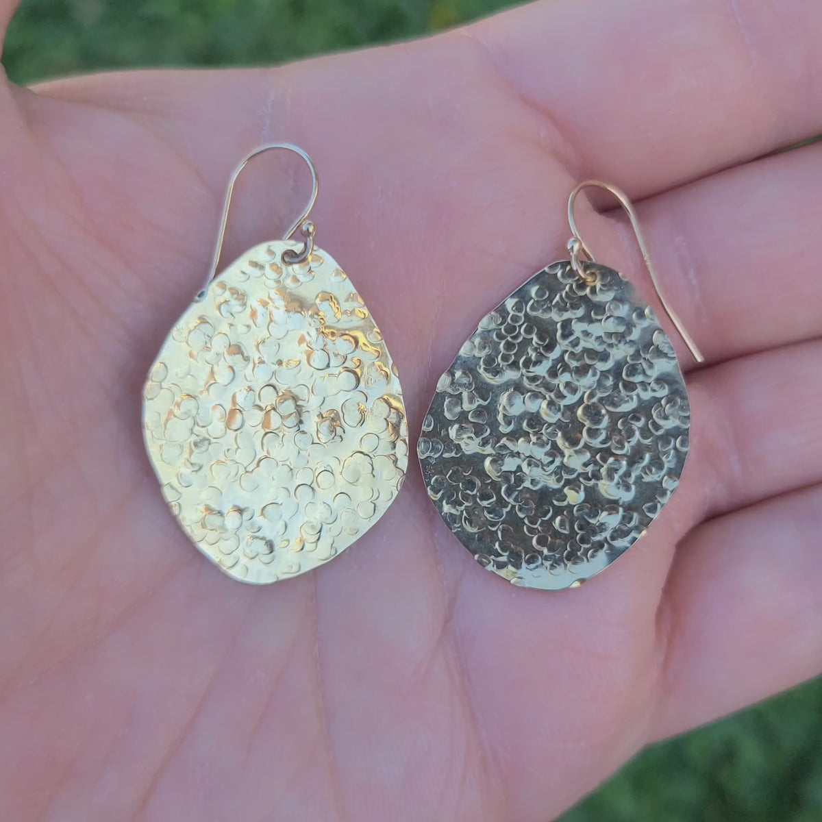 These hammered earrings combine artisanal craftsmanship with modern design, resulting in a piece that's both timeless and contemporary. The organic texture evokes the smooth, weathered surface of river pebbles, bringing a touch of nature's beauty to your jewelry collection. The generous size ensures these earrings won't go unnoticed, while the light-reflecting properties of the hammered surface add a subtle shimmer that enhances your natural glow. Whether you're dressing up for a special occasion or adding a touch of elegance to your everyday look, these versatile earrings are the perfect choice. Crafted from recycled 14-karat yellow gold, these earrings are not only beautiful but also environmentally conscious. By choosing these earrings, you're making a statement about your style and your commitment to sustainable fashion.